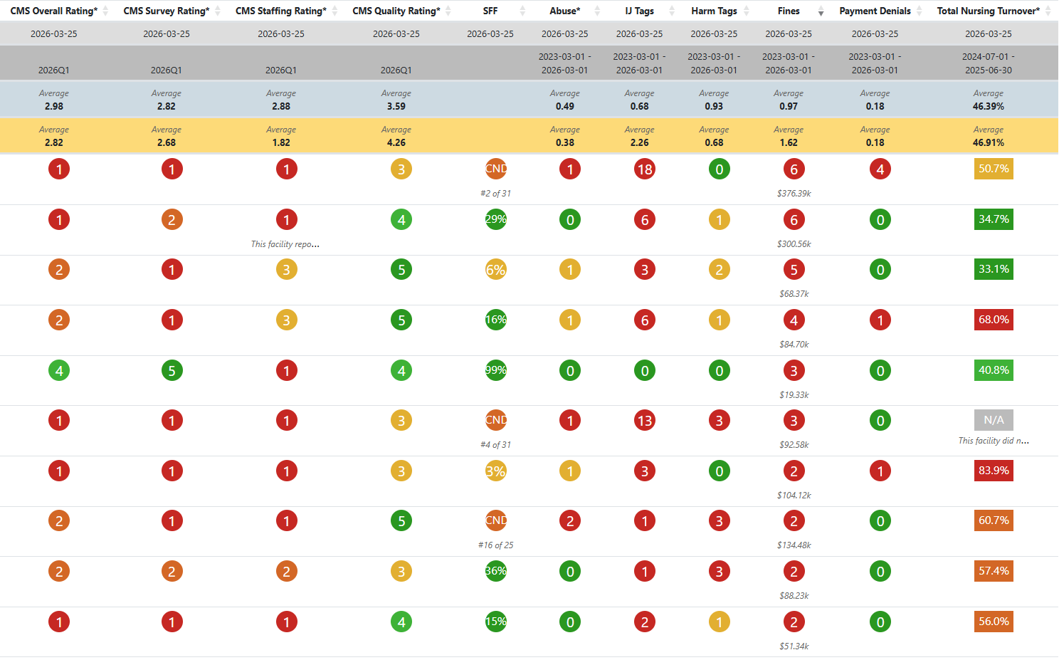 This view compares each facility across CMS star ratings, survey performance, compliance risk, and turnover—showing how it ranks relative to its peers.